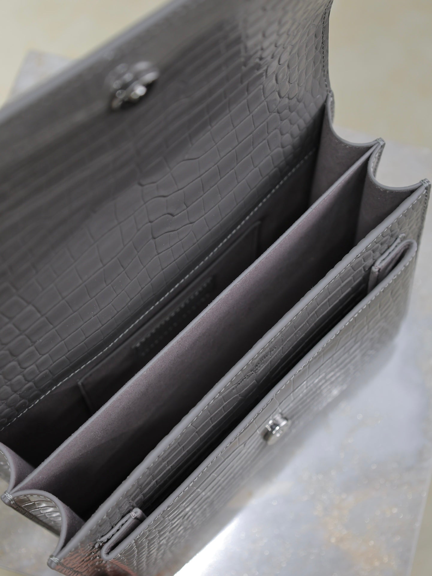 YSL 25S SUNSET MEDIUM 22 IN DARK GRAY CROCODILE-EMBOSSED SHINY CALFSKIN SILVER HARDWARE