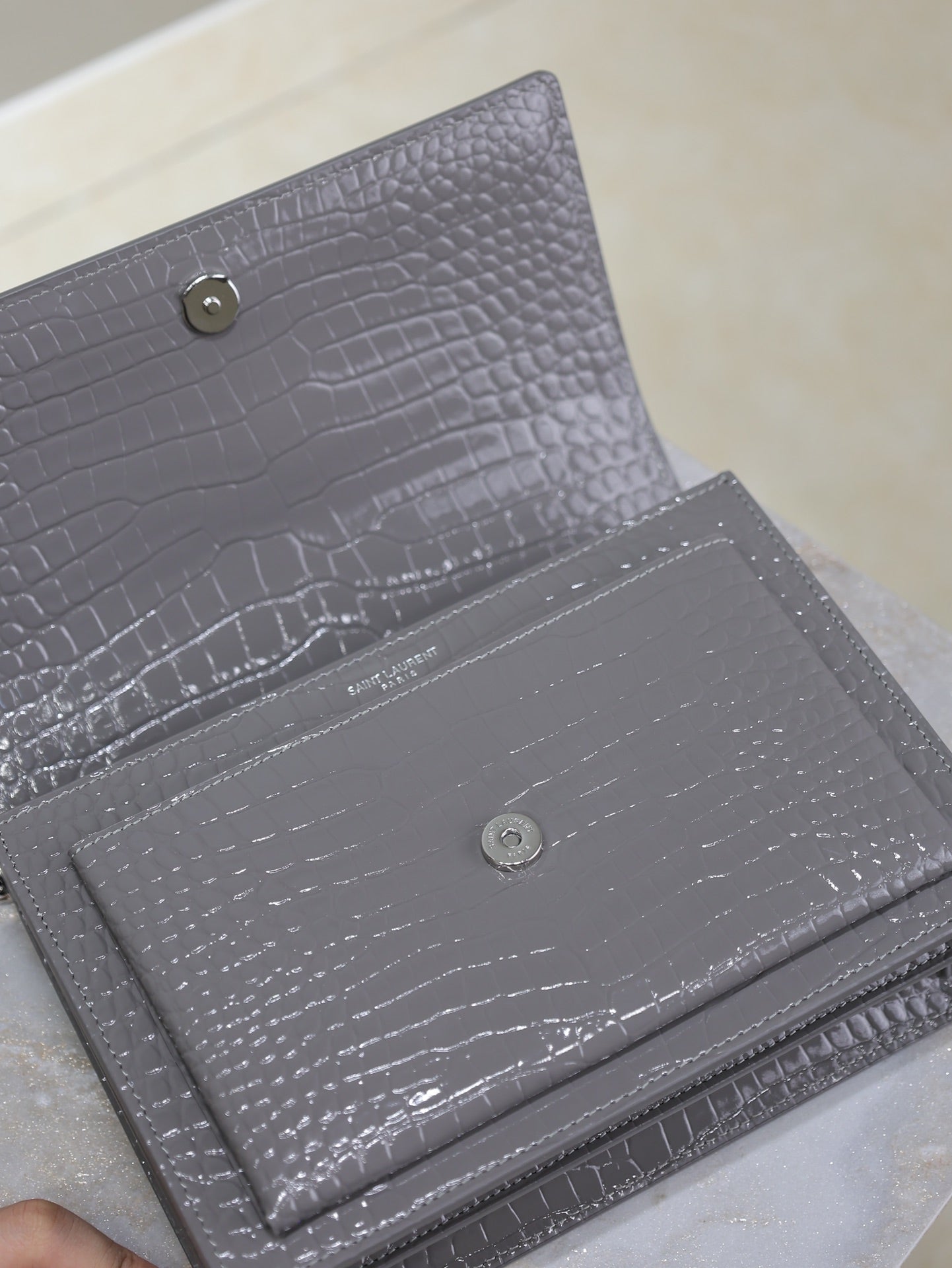 YSL 25S SUNSET MEDIUM 22 IN DARK GRAY CROCODILE-EMBOSSED SHINY CALFSKIN SILVER HARDWRE